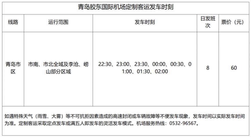 乘坐定制客运的旅客,可通过“悦程出行”小程序查询相关班次时刻信息。也可通过机场服务电话0532-96567进行咨询。