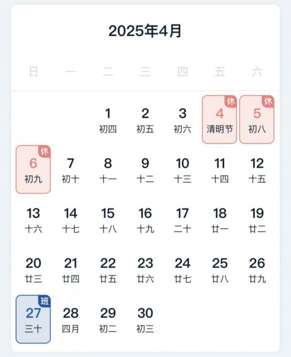 2025清明节是几月几号? 2025清明节为4月4日,放假时间为4月4日(周五)至6日(周日)放假,共3天,不调休。  截图自:国务院客户端小程序 2025年元旦、春节、清明节、劳动节、端午节、中秋节和国庆节放假调休日期的具体安排如下: 一、元旦:1月1日(周三)放假1天,不调休。 二、春节:1月28日(农历除夕、周二)至2月4日(农历正月初七、周二)放假调休,共8天。1月26日(周日)、2月8日(周六)上班。 三、清明节:4月4日(周五)至6日(周日)放假,共3天。 四、劳动节:5月1日(周四)至5日(周一)放假调休,共5天。4月27日(周日)上班。 五、端午节:5月31日(周六)至6月2日(周一)放假,共3天。 六、国庆节、中秋节:10月1日(周三)至8日(周三)放假调休,共8天。9月28日(周日)、10月11日(周六)上班。 举报