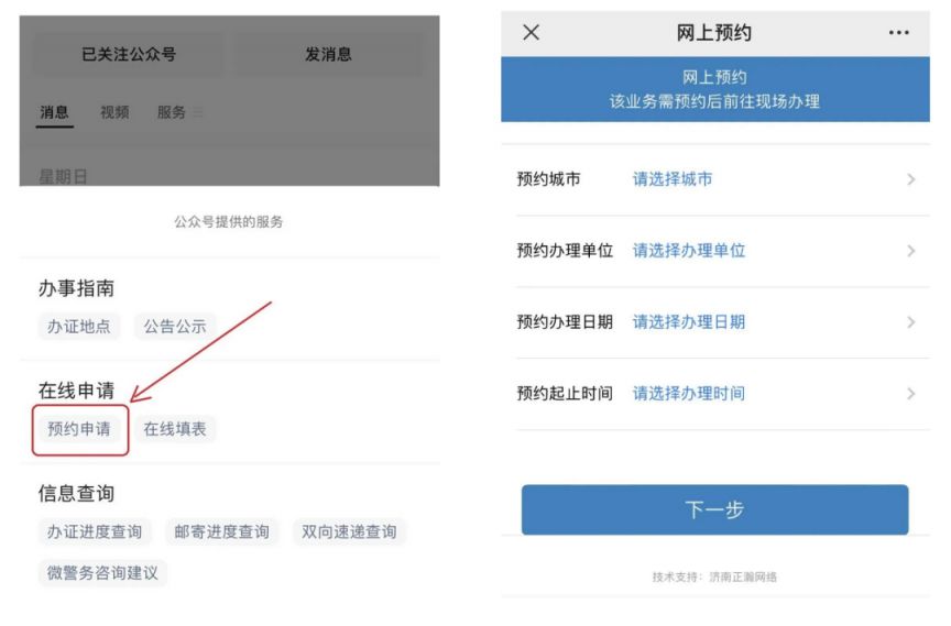 进入“山东出入境”微信公众号-在线申请-预约申请-选择预约城市、预约办理单位、预约办理日期及时间段-填写申请信息(如无法选择预约时间段,说明此日期已约满)。