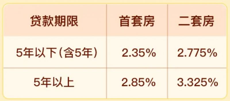购买首套自住住房的,5年以下(含5年)贷款利率为2.35%,5年以上贷款利率为2.85%;购买二套自住住房的,5年以下(含5年)贷款利率为2.775%,5年以上贷款利率为3.325%。
