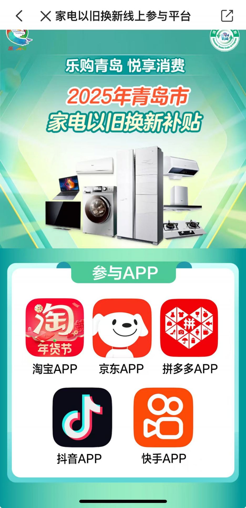 指定APP或微信小程序中的“青岛家电以旧换新专区”中的店铺及商品。可通过在APP或微信小程序首页搜索“青岛以旧换新”进入。参与APP详见“参与平台”。