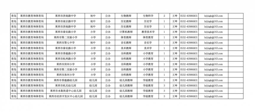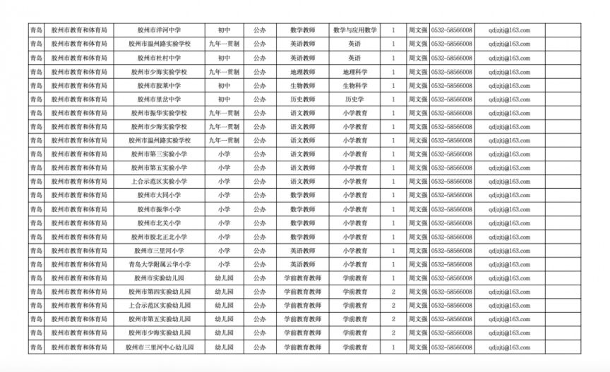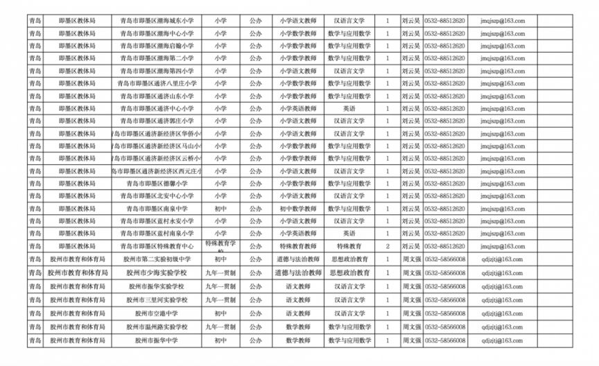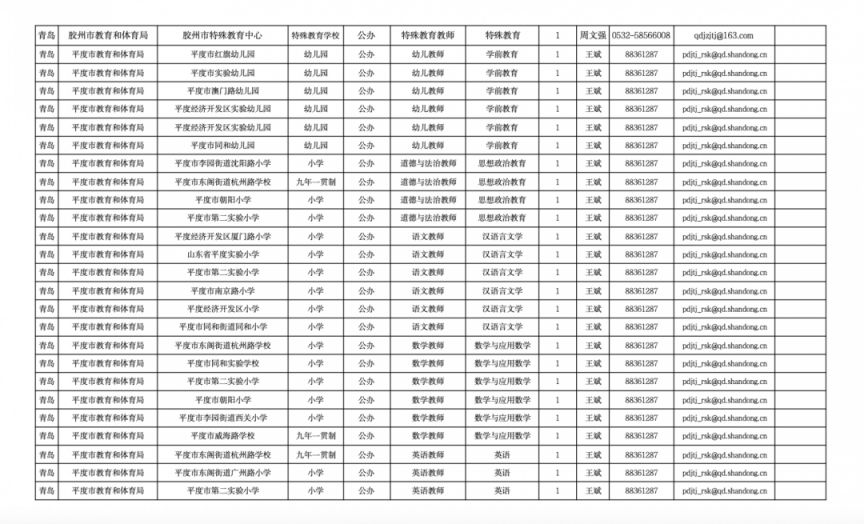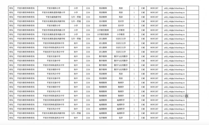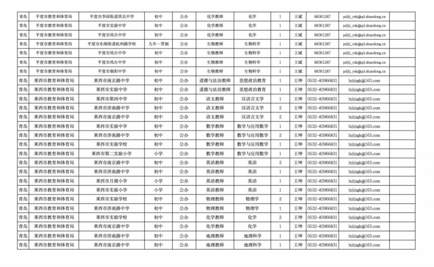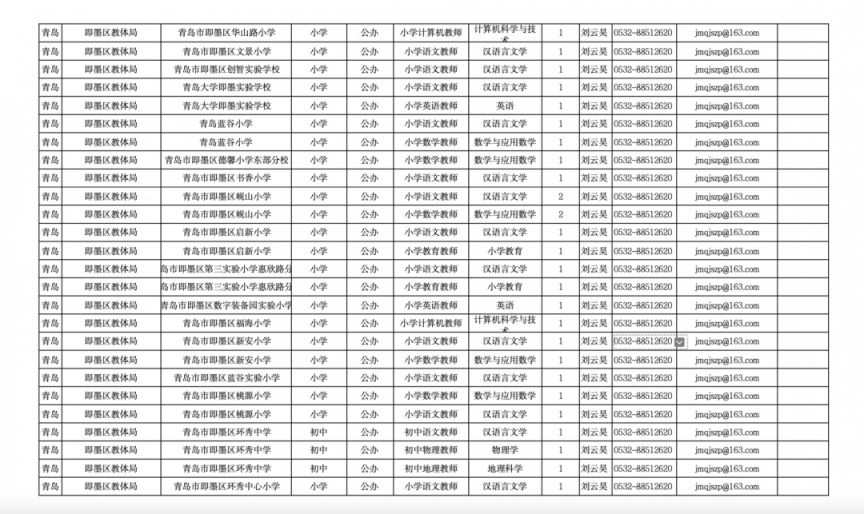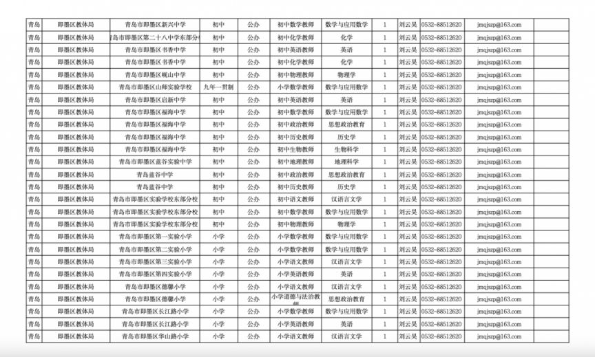 此次共有黄岛区、即墨区、胶州市、平度市、莱西市参与招聘,招聘涉及语文、数学、英语、物理、化学、生物、思政(道德与法治)、历史、地理、信息技术、美术、心理、幼儿、特教等岗位。从招聘计划看,黄岛区计划招聘22人,即墨区计划招聘76人,胶州市计划招聘36人,平度市计划招聘58人,莱西市计划招聘50人。