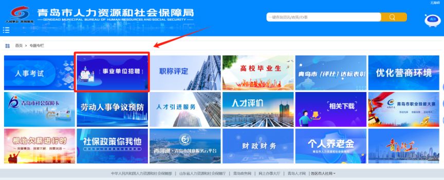 网上报名期间,应聘人员登录青岛市人力资源和社会保障局官网(http://hrss.qingdao.gov.cn),选择“专题专栏”中“事业单位招聘”专栏,点击“网上报名”,进入网上报名系统(以下简称“报名系统”)报名。