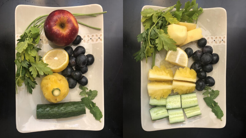 準备苹果一颗,凤梨试大小半颗或一颗,葡萄一些、黄瓜半根,接着半颗柠檬、一把香菜,最后同样加入薄荷叶几片,除了有满满凤梨酵素外,黄瓜中的多种维生素也能加速体内代谢。
