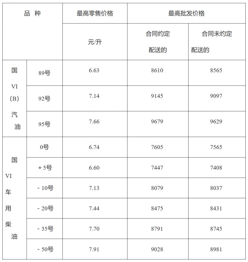 2.表中所列价格为国VI标准的汽、柴油价格。