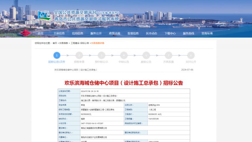 【7月5日更新】7月5日,青岛市北城发产业发展有限公司在青岛市公共资源交易电子服务系统发布欢乐滨海城仓储中心项目(设计施工总承包)招标计划,估算建设投资662,560,000元。
