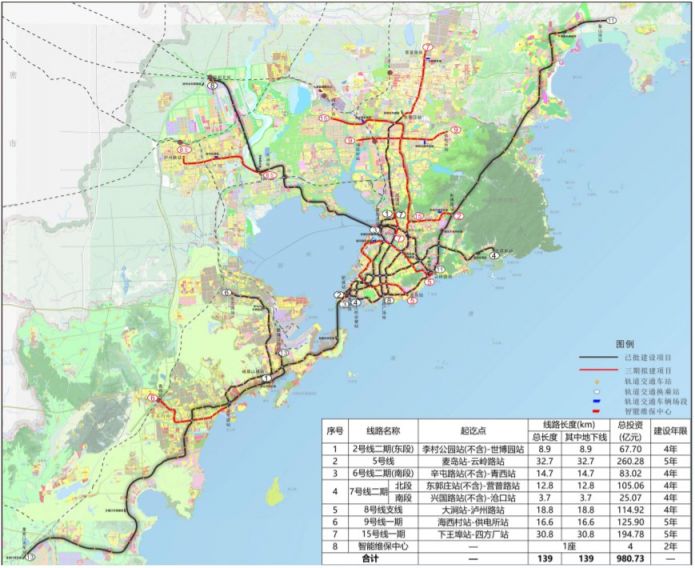 为落实国家战略部署,支持城市重点区域开发,完善轨道交通网络布局,提升城市公共交通服务水平,原则同意青岛市城市轨道交通第三期建设规划,建设2号线二期、5号线、6号线二期、7号线二期、8号线支线、9号线一期和15号线一期等7个项目,规划期为2021-2026年。
